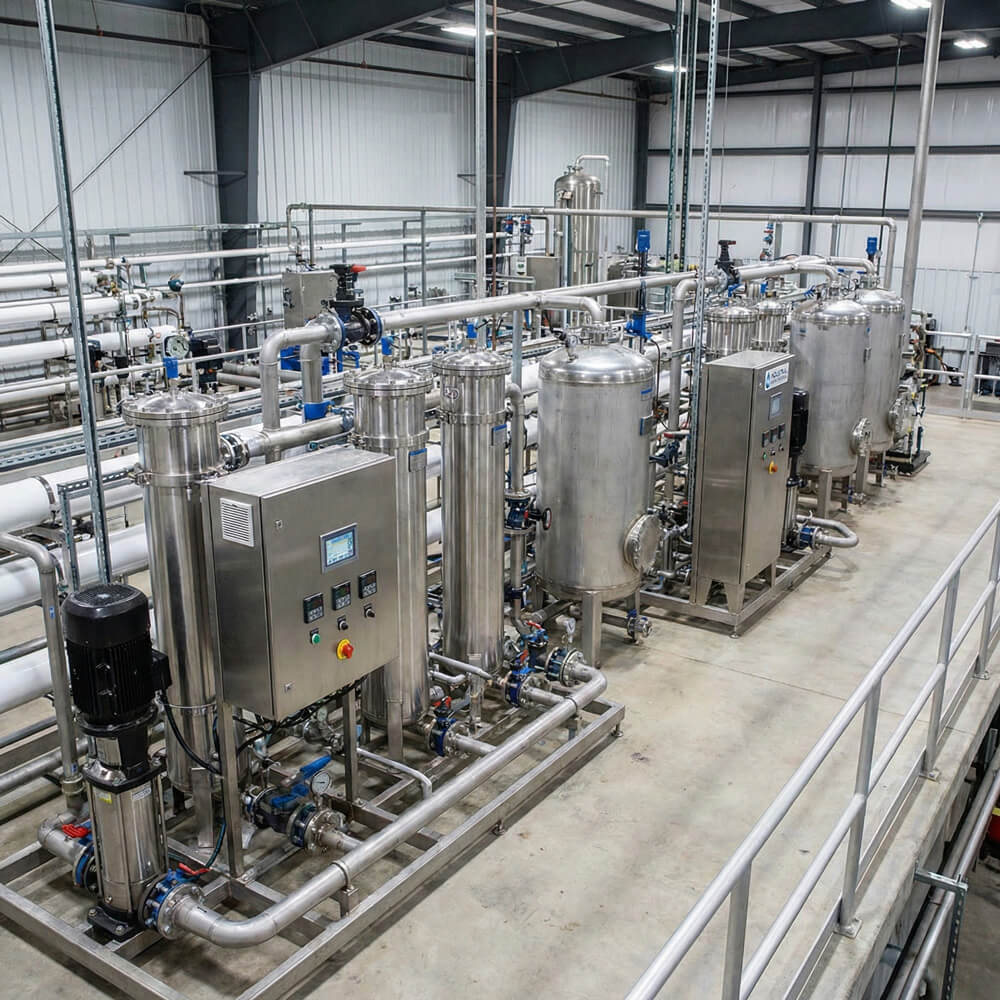 Filters water through semi-permeable membranes to remove up to 99% of dissolved salts, organics, and contaminants. RO systems provide cost-effective purification for process water, boiler feed, and product manufacturing.